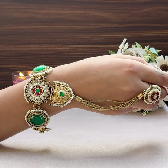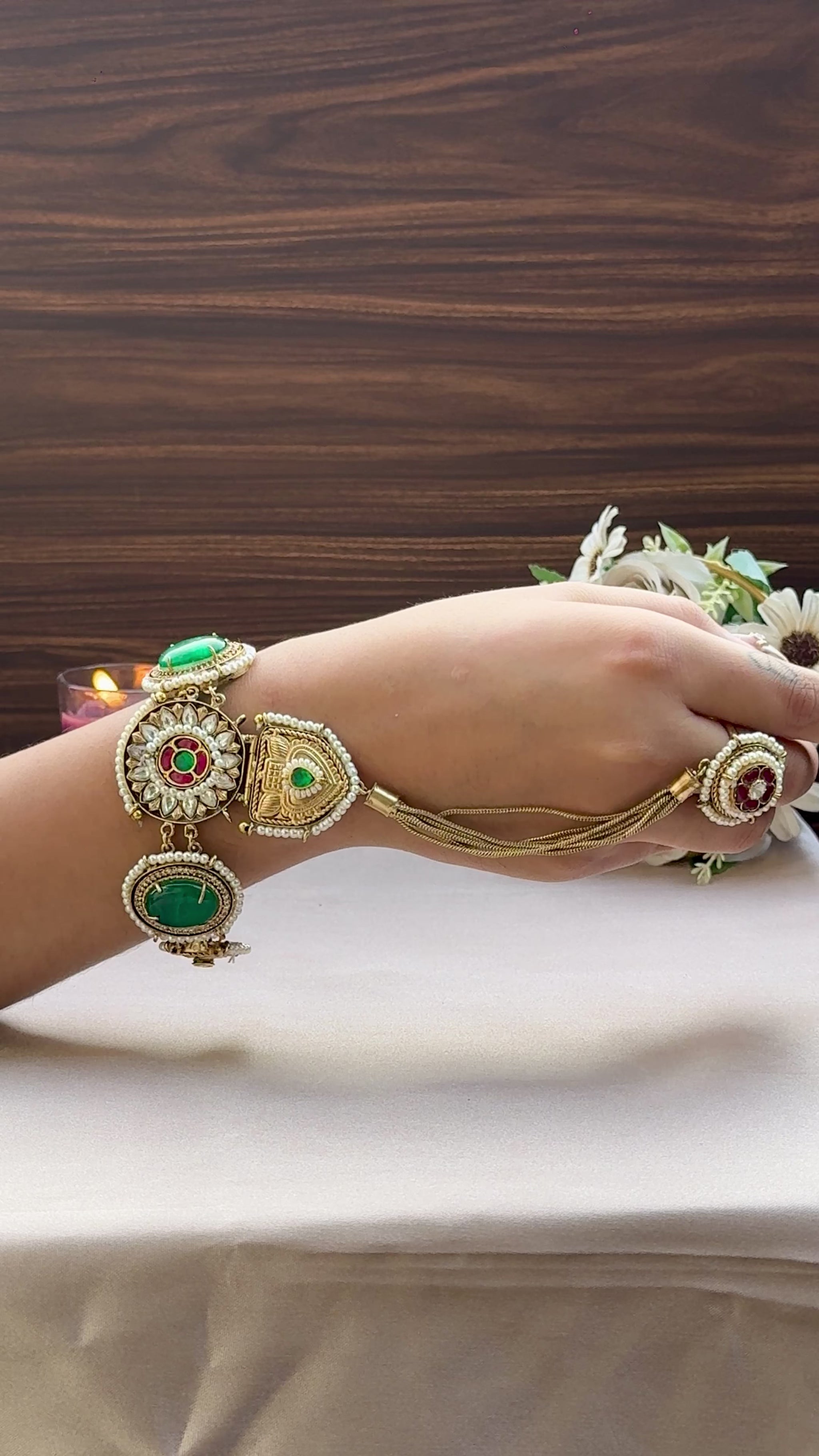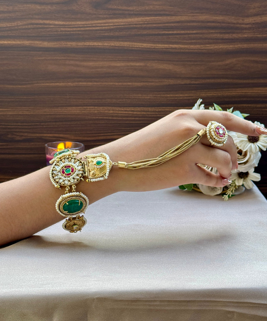 A symbol of love, elegance, and togetherness — the ‘Nazaakat’ Bracelet comes with a delicately attached ring, creating a statement look of timeless charm. Intricately designed, it beautifully binds the wrist and finger, making it the perfect piece for festive wear, weddings, or special occasions.