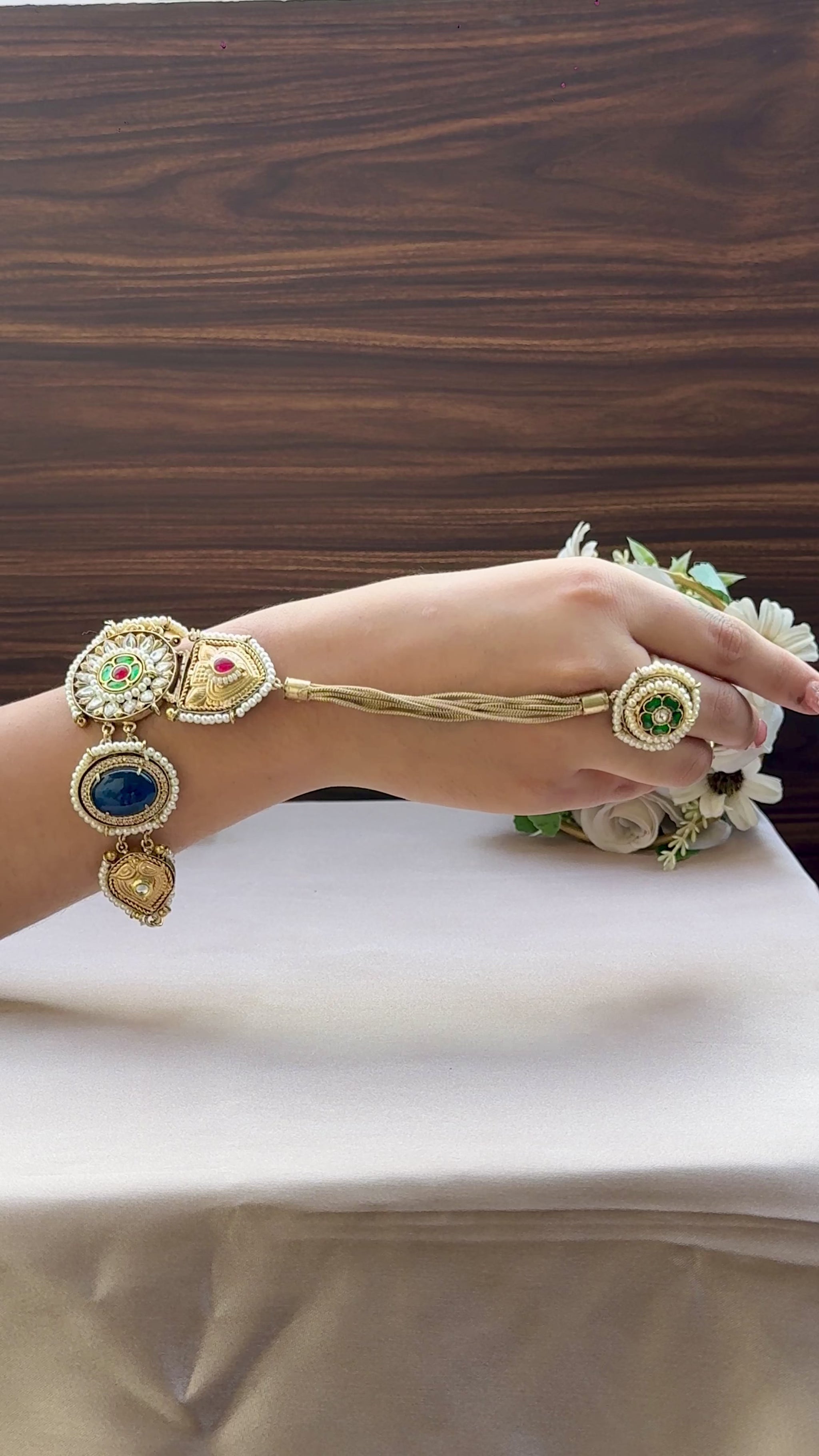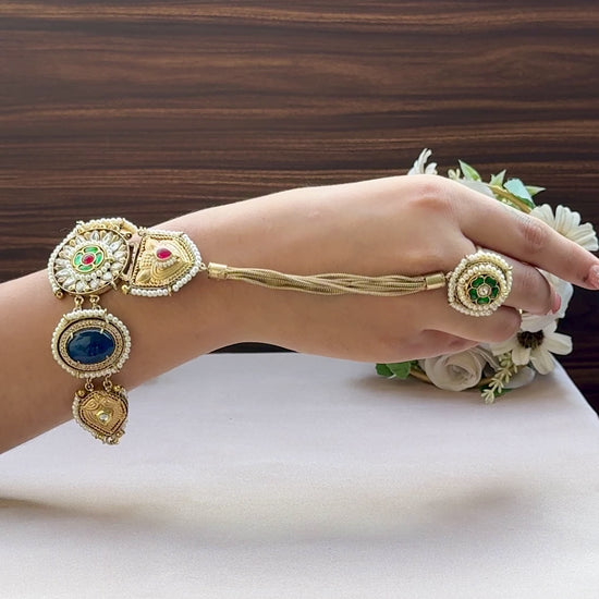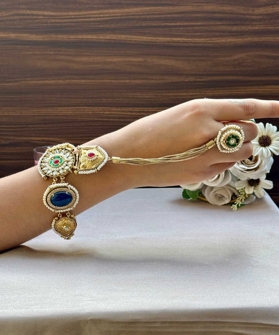 A symbol of love, elegance, and togetherness — the ‘Nazaakat’ Bracelet comes with a delicately attached ring, creating a statement look of timeless charm. Intricately designed, it beautifully binds the wrist and finger, making it the perfect piece for festive wear, weddings, or special occasions.