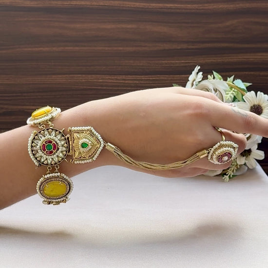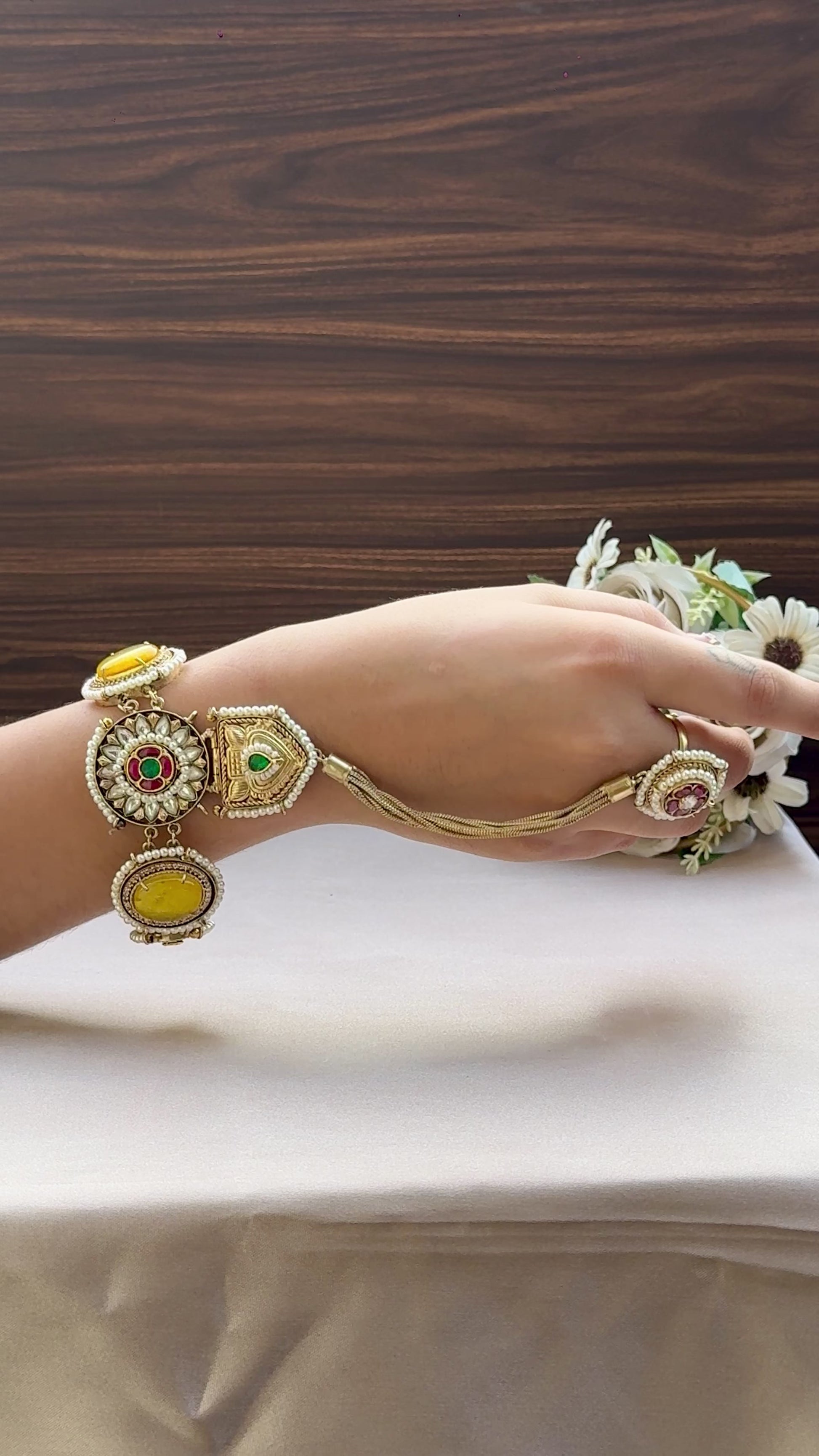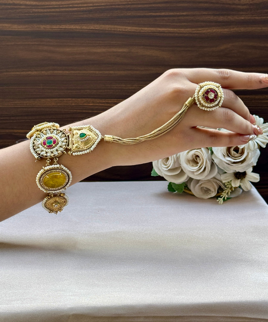 A symbol of love, elegance, and togetherness — the ‘Nazaakat’ Bracelet comes with a delicately attached ring, creating a statement look of timeless charm. Intricately designed, it beautifully binds the wrist and finger, making it the perfect piece for festive wear, weddings, or special occasions.