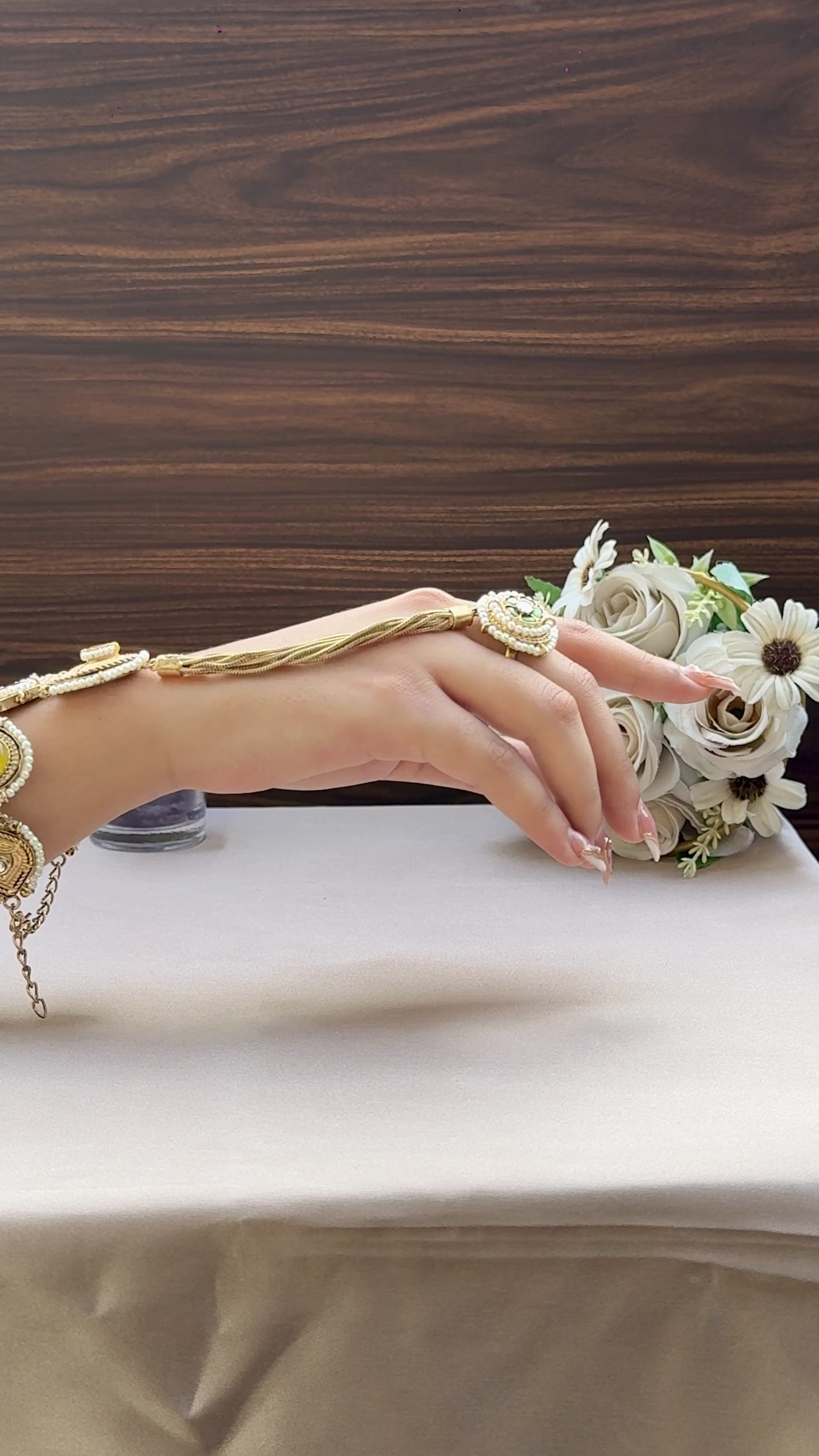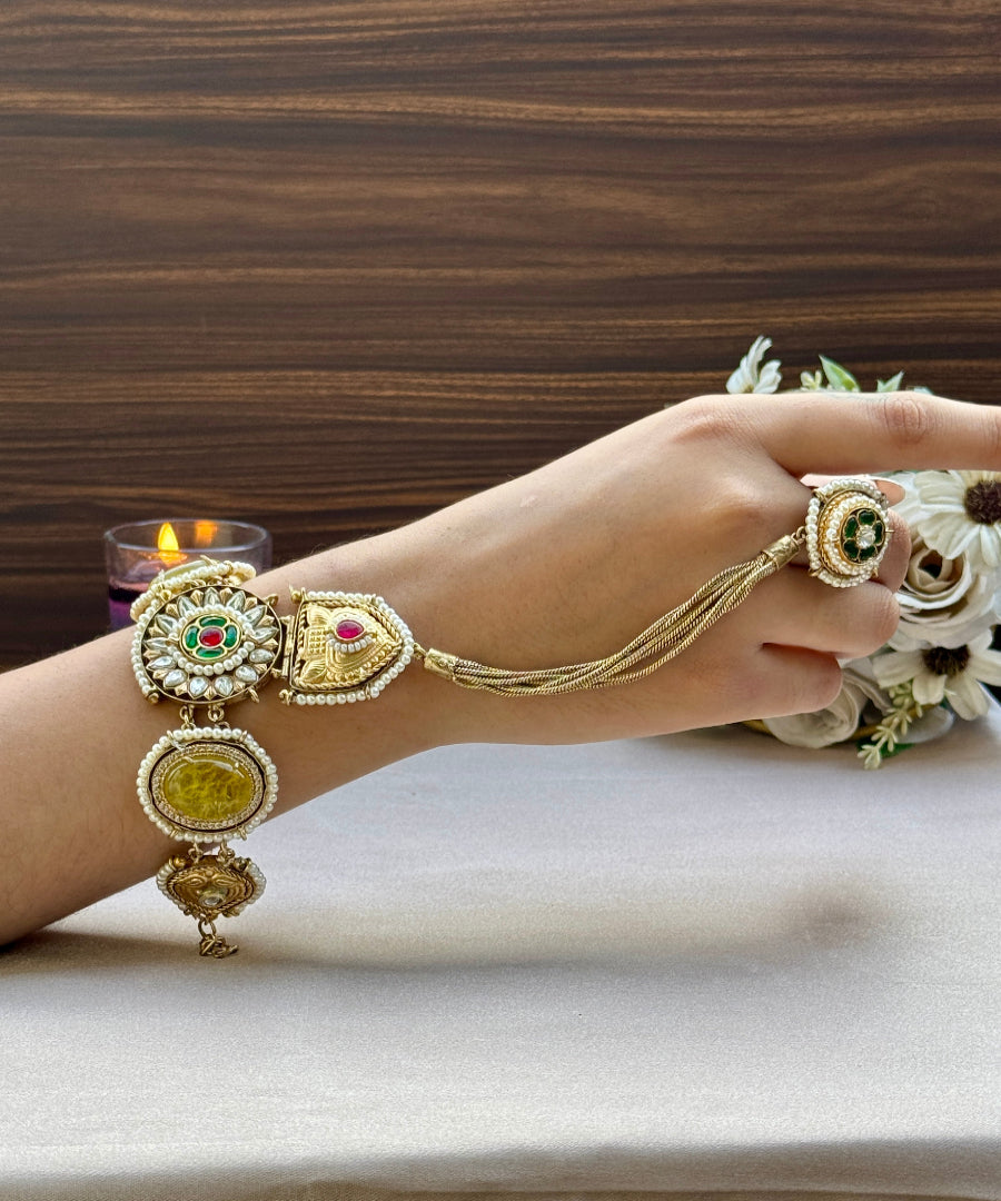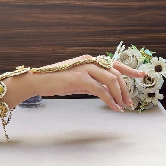 A symbol of love, elegance, and togetherness — the ‘Nazaakat’ Bracelet comes with a delicately attached ring, creating a statement look of timeless charm. Intricately designed, it beautifully binds the wrist and finger, making it the perfect piece for festive wear, weddings, or special occasions.