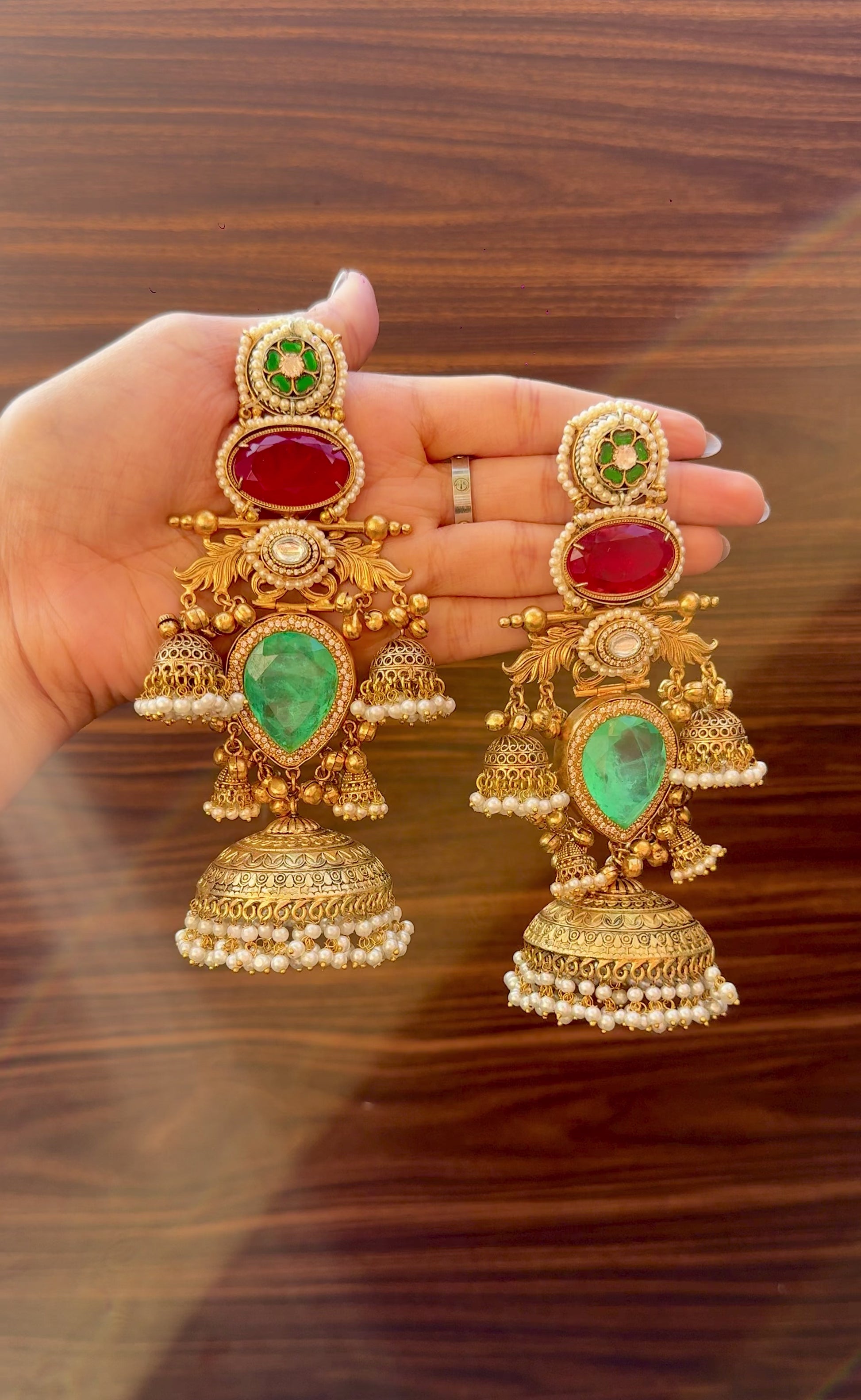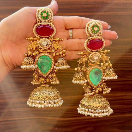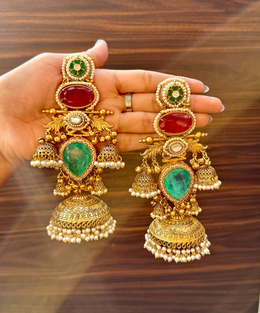 A stunning fusion of red and green hues, these long earrings radiate pure festive charm. The classic colour combination paired with intricate detailing makes them a perfect match for weddings, sangeet and traditional celebrations.