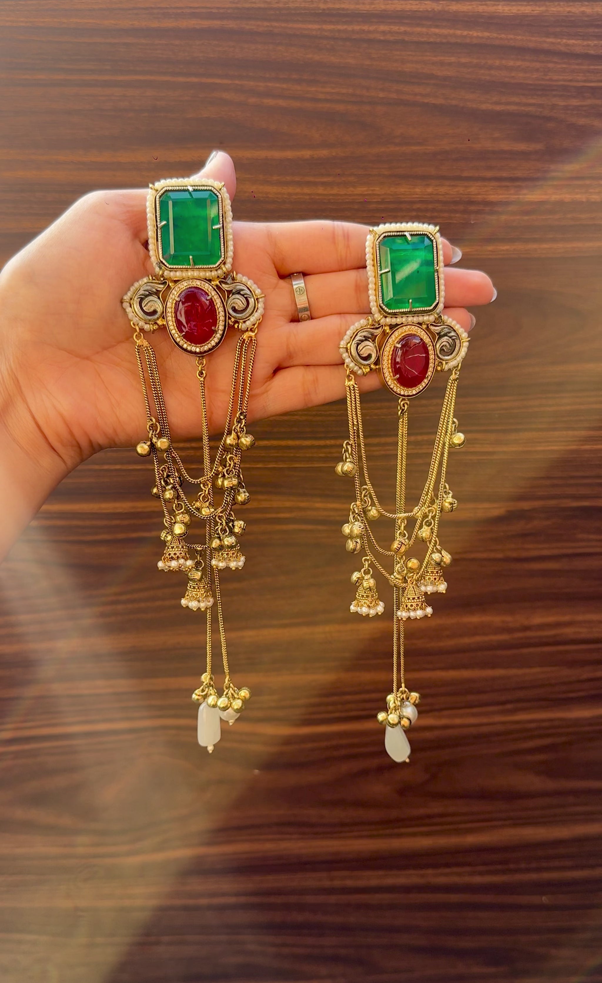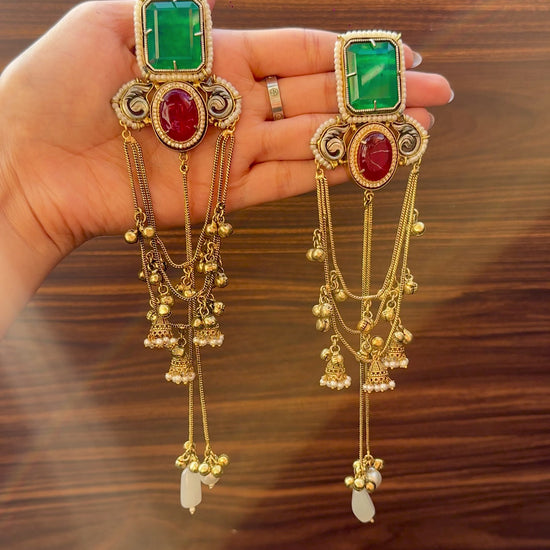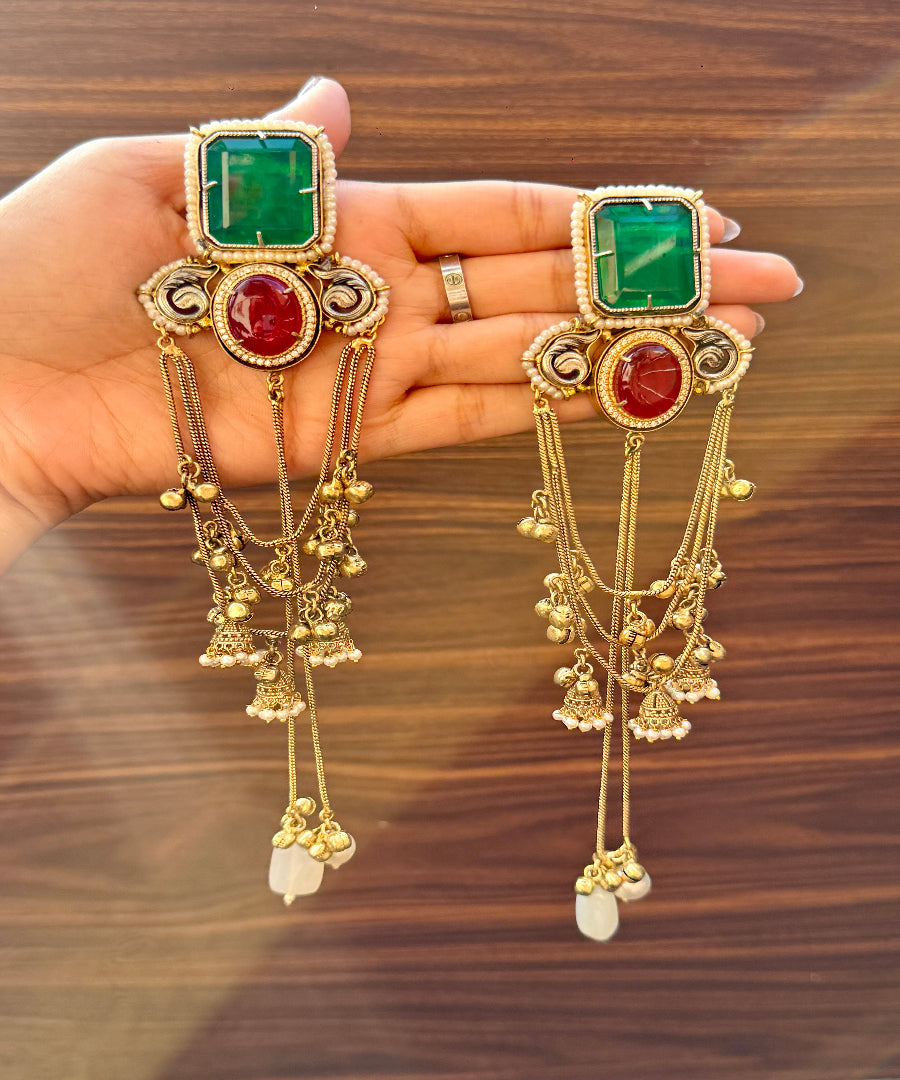 A stunning fusion of red and green hues, these long earrings radiate pure festive charm. The classic colour combination paired with intricate detailing makes them a perfect match for weddings, sangeet and traditional celebrations.