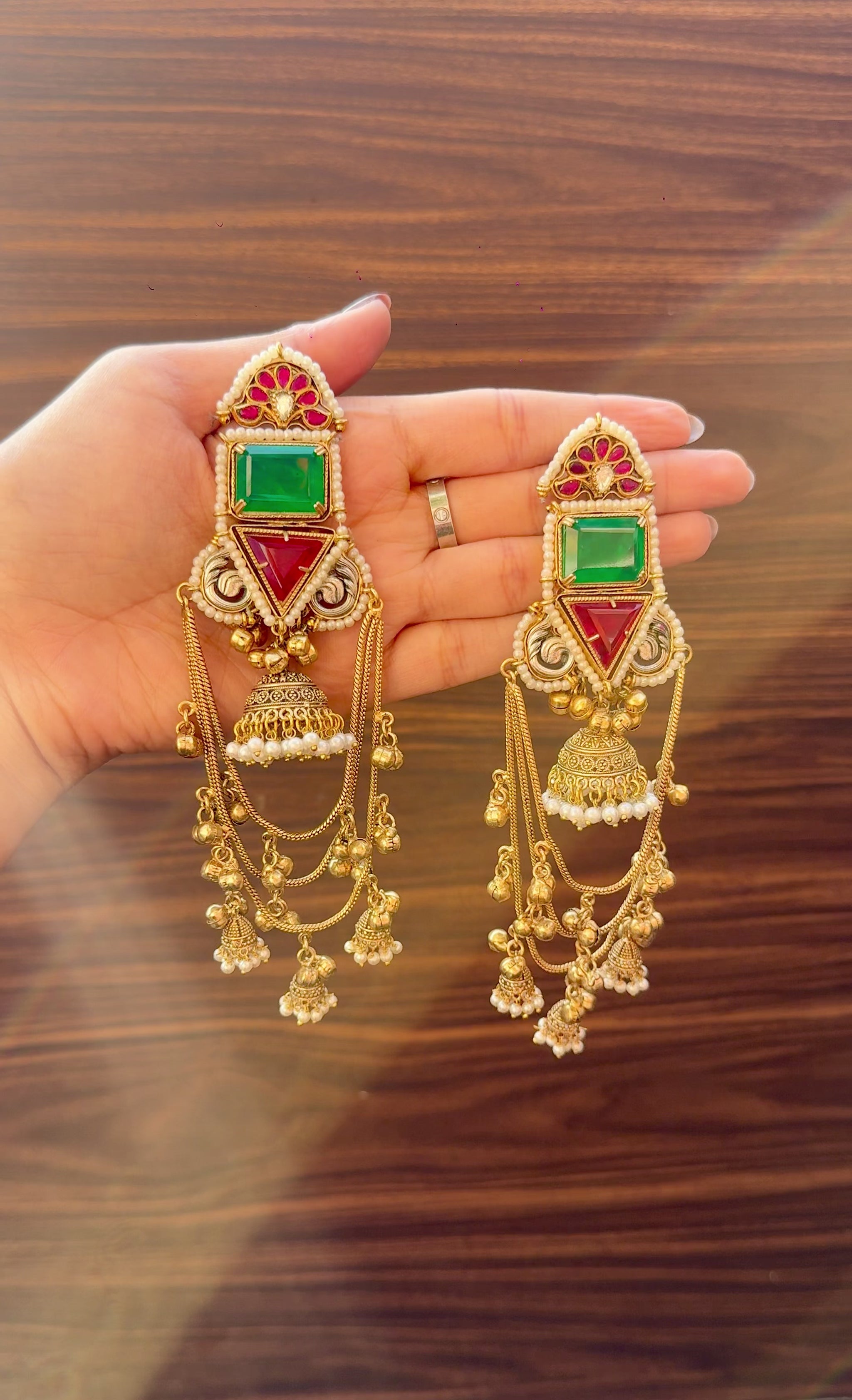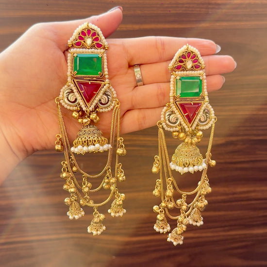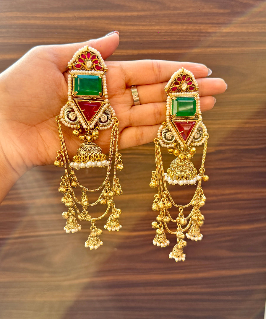 A stunning fusion of red and green hues, these long earrings radiate pure festive charm. The classic colour combination paired with intricate detailing makes them a perfect match for weddings, sangeet and traditional celebrations.