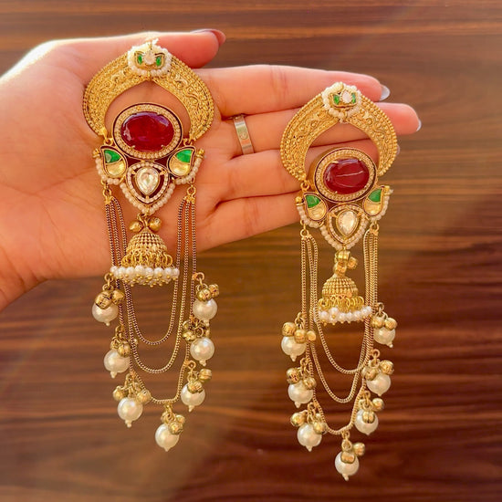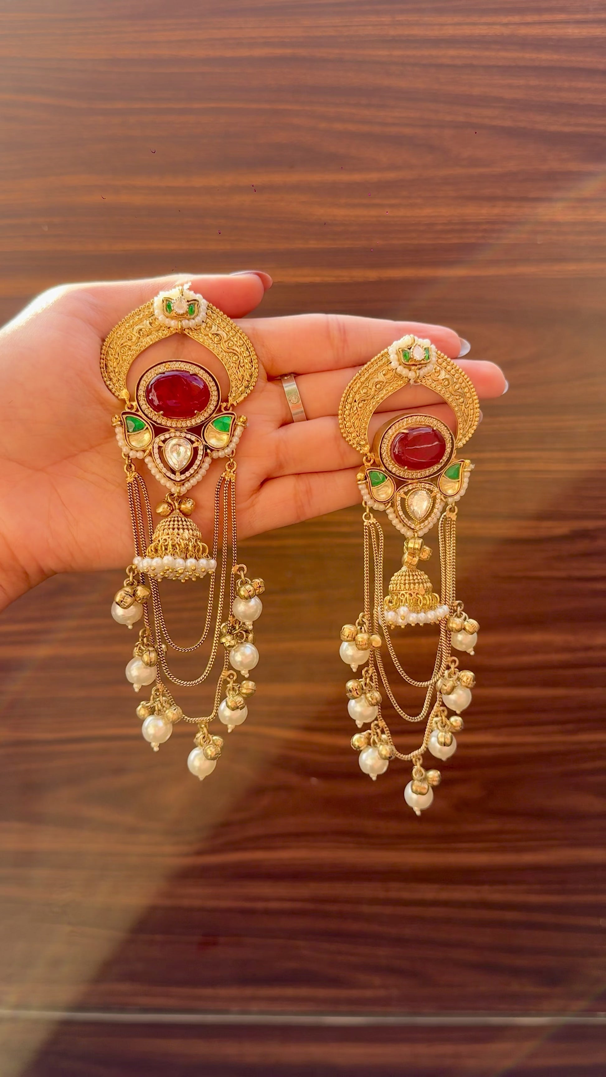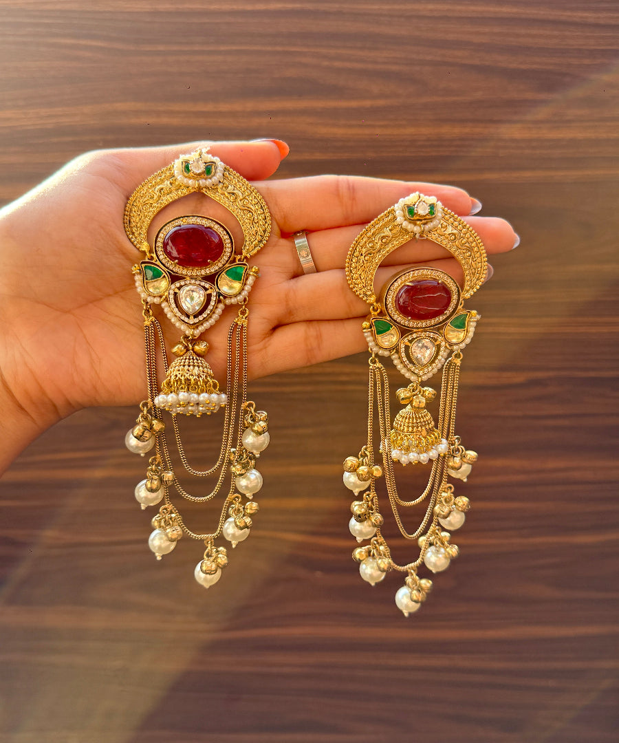 Royal red at its finest. These earrings feature gleaming red stones that exude richness and tradition, making them the perfect choice for weddings, festivals and grand celebrations.