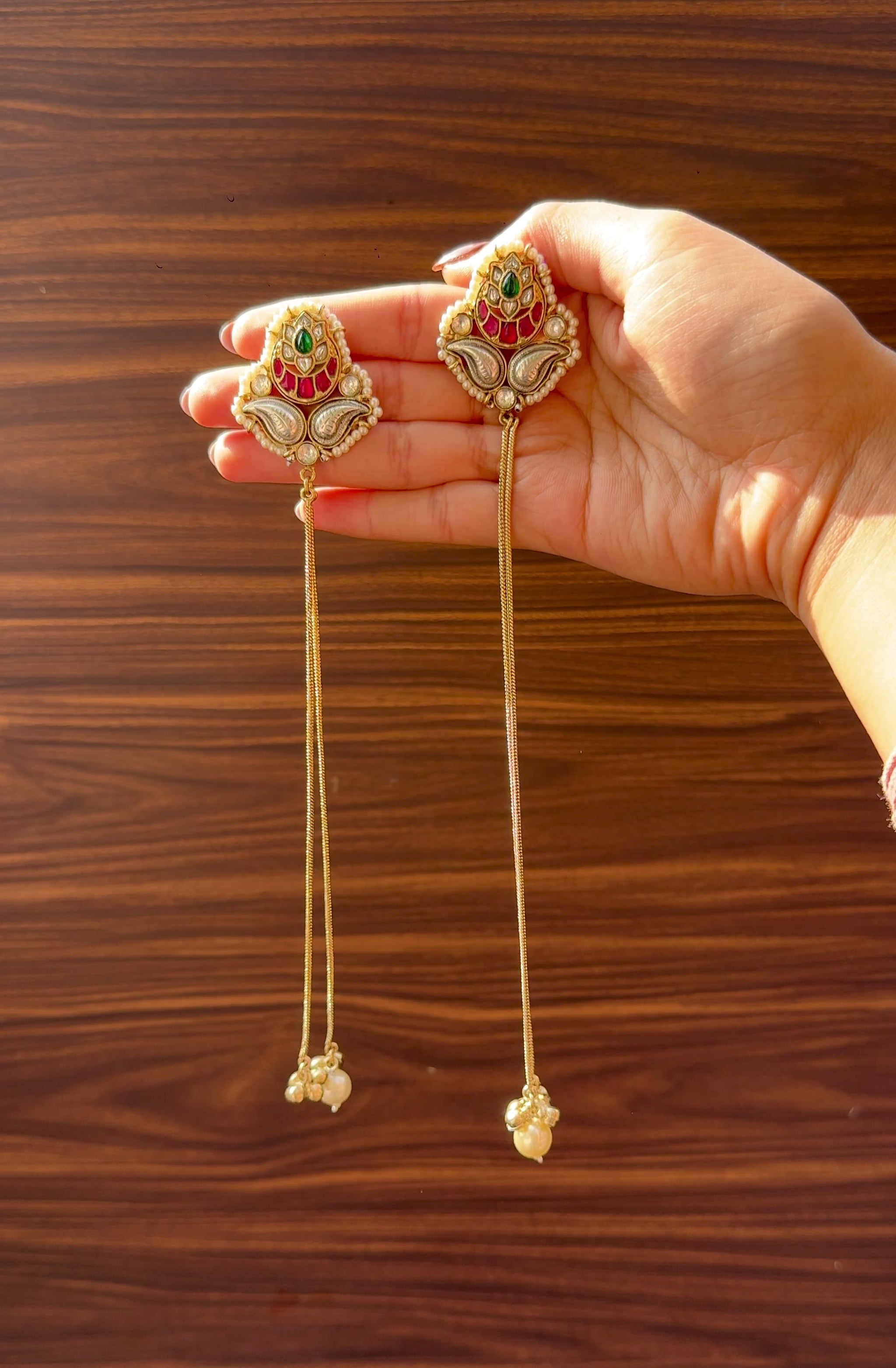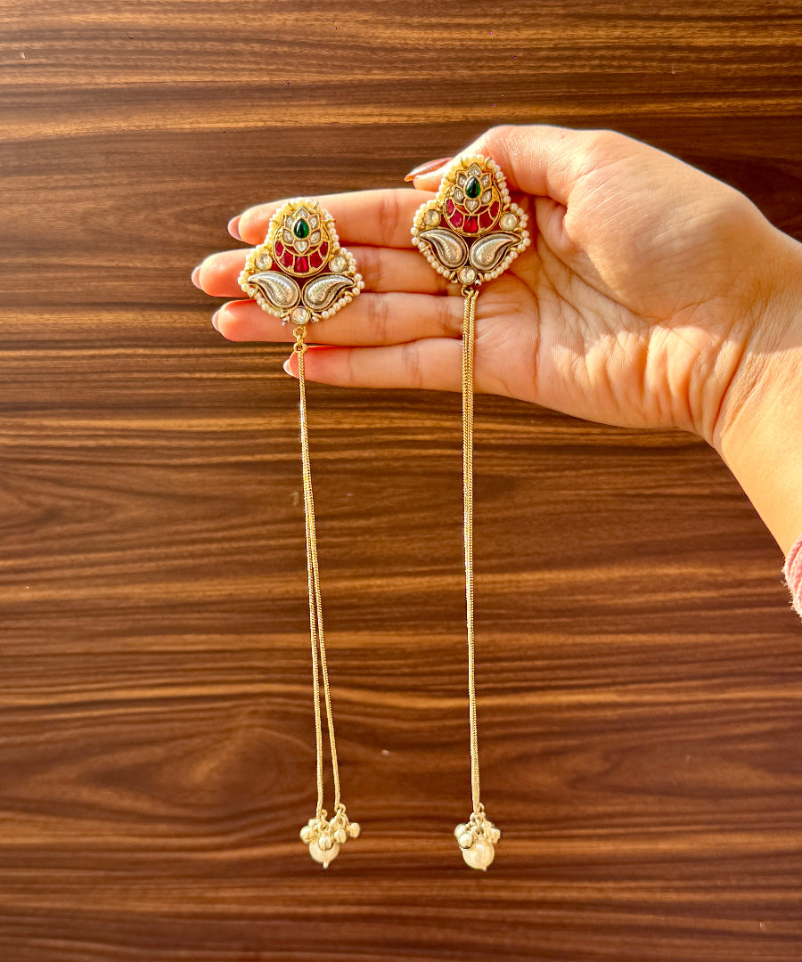These Minimal Kashmiri Earrings carry the quiet charm of Kashmir in their delicate design. Lightweight, elegant and effortless, they add a soft ethnic touch without overpowering your look — perfect for everyday wear and subtle festive styling.