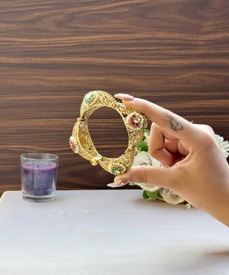 Truly ‘Nayab’ , this Kada cum Bracelet is crafted in the prettiest design of all time. With a free-size fit and secure lock, it offers both elegance and comfort. The intricate detailing gives it a regal charm, making it the perfect choice for weddings, festive looks, or everyday statement styling.