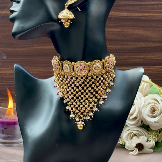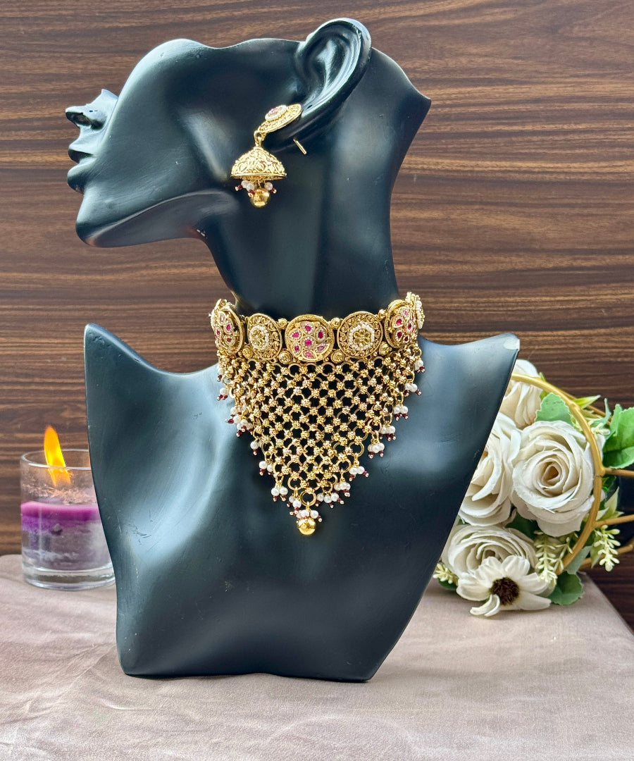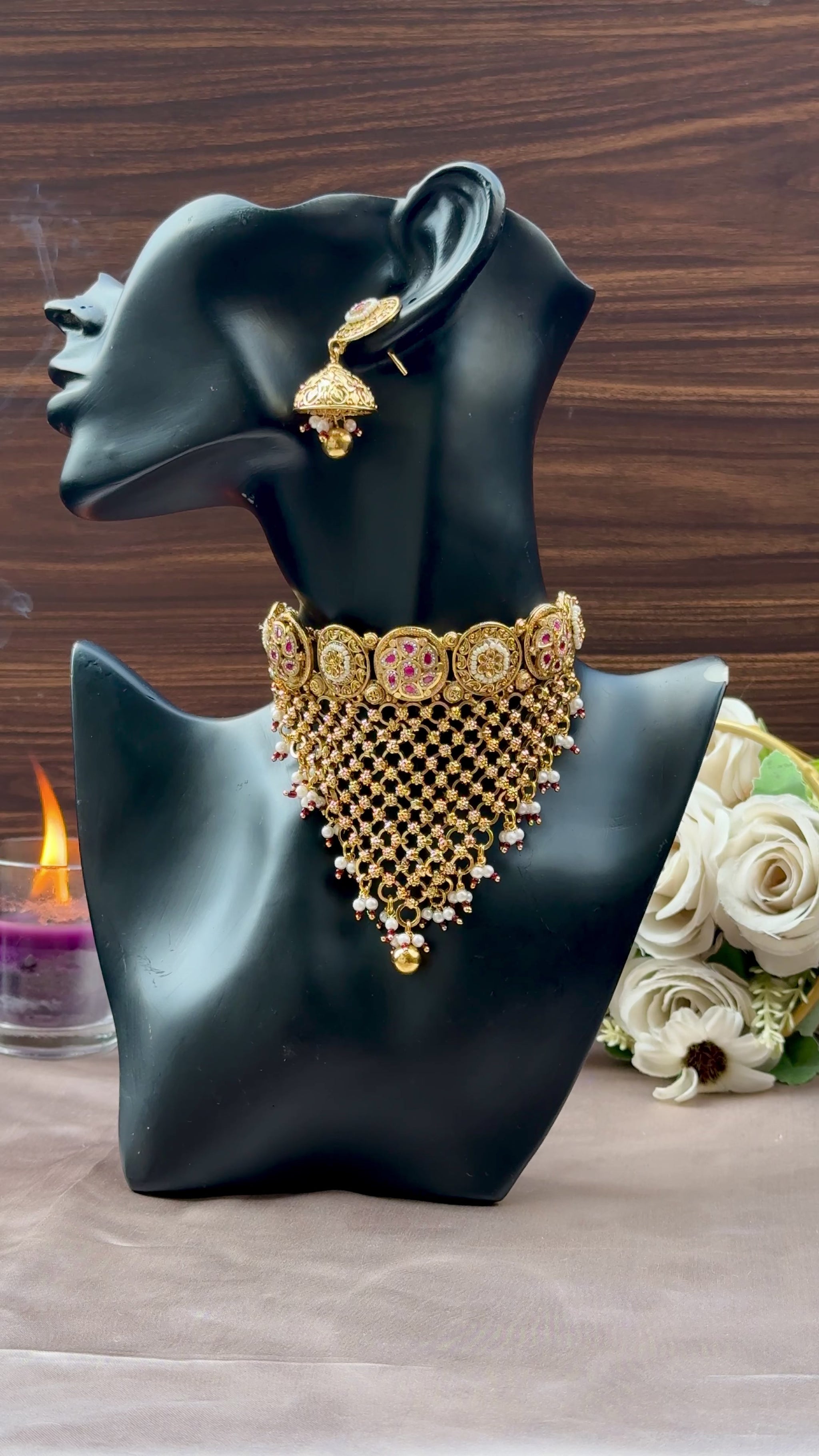 Crafted in a rich gold-look finish, this piece radiates timeless charm and festive grandeur. Its intricate detailing reflects the beauty of age-old artistry while the golden sheen adds a regal touch to your every look. Perfect for weddings, festive occasions, or when you simply wish to shine with elegance.