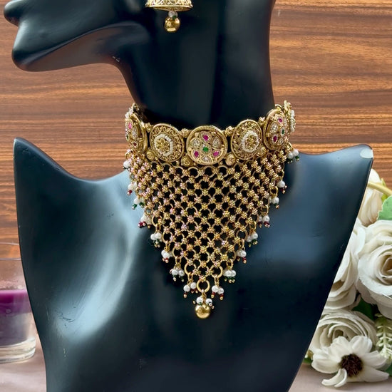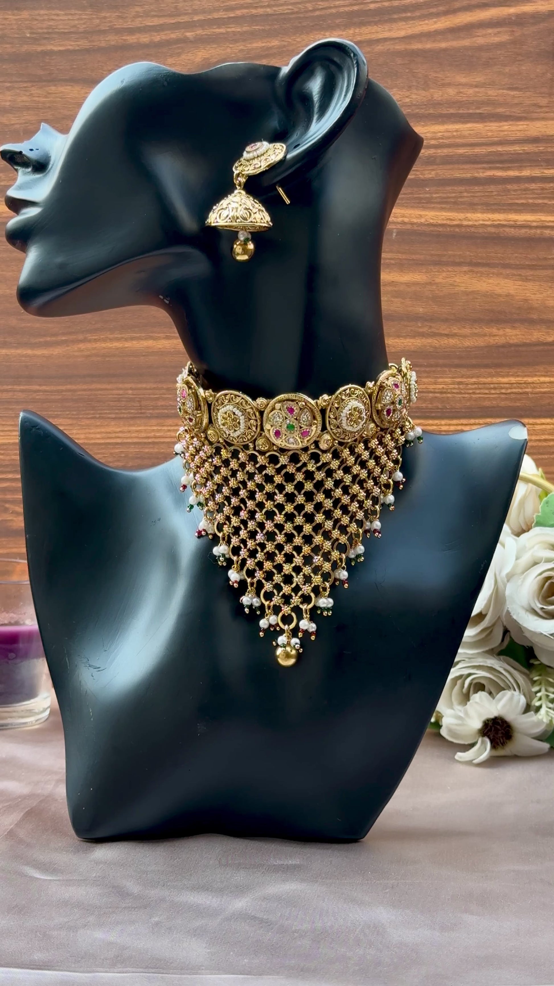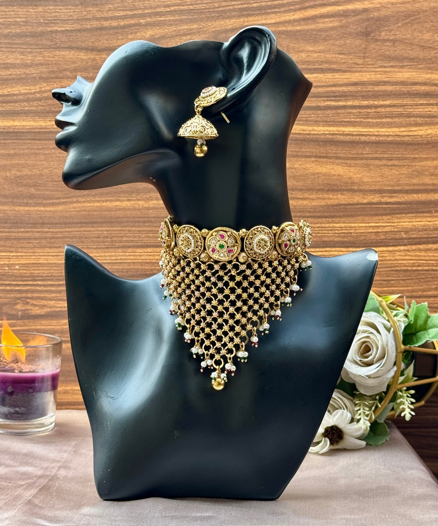 Crafted in a rich gold-look finish, this piece radiates timeless charm and festive grandeur. Its intricate detailing reflects the beauty of age-old artistry while the golden sheen adds a regal touch to your every look. Perfect for weddings, festive occasions, or when you simply wish to shine with elegance.