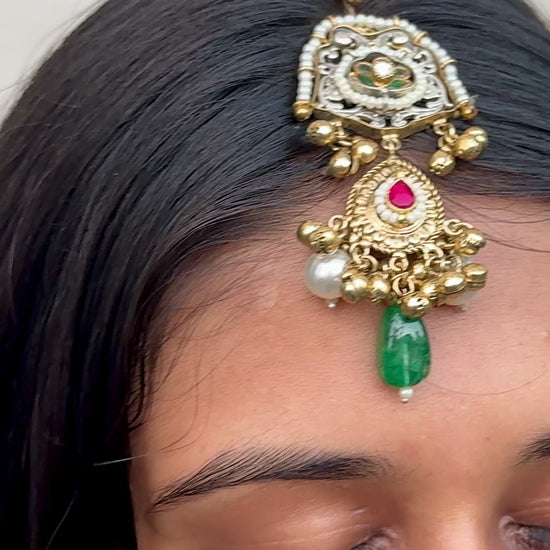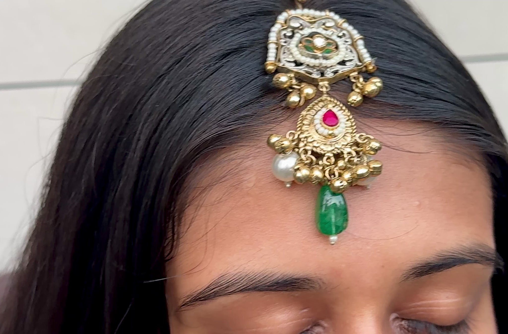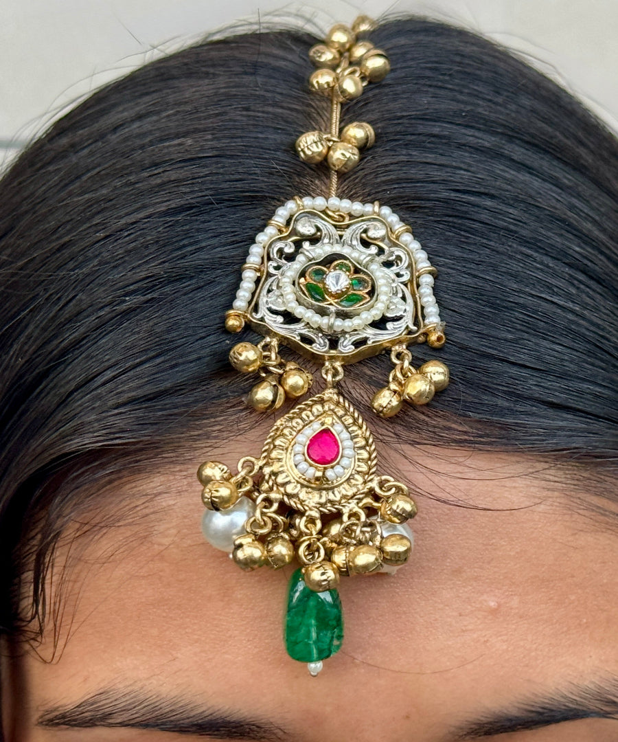 A crown that celebrates love in its purest form. The ‘Taj-e-Ishq’ Maang Tikka is intricately handcrafted with delicate detailing, designed to rest beautifully on your forehead like a symbol of eternal affection. Its luminous finish and regal charm make it the perfect piece for brides and festive occasions.